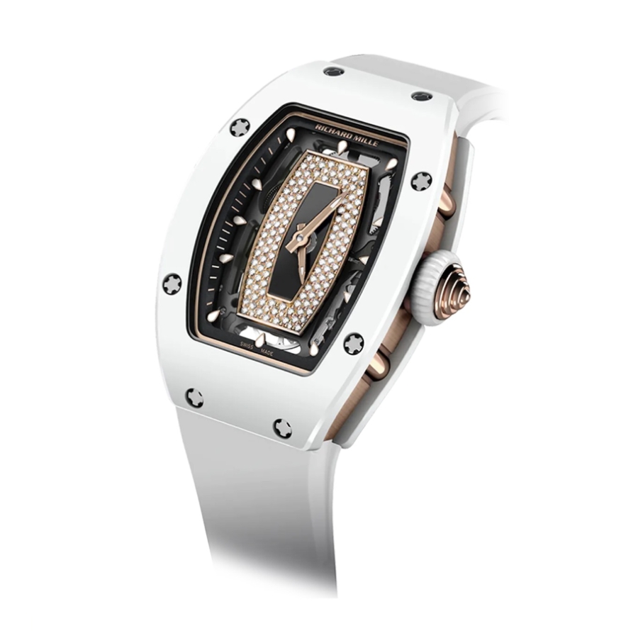 Richard Mille RM 07-01 White Ceramic Automatic Winding là một siêu phẩm đồng hồ dành cho những khách hàng nữ, có mặt số 45,66mmx31,4mm được thiết kế skeleton đã tạo thành điểm nhấn vô cùng khác biệt. Mặt kính chất liệu Sapphire với khả năng chống sốc và chống xây xước tuyệt vời đi kèm mặt số được chạm khắc kim cương quý phái, cùng bộ kim đồng hồ vàng. Những mốc chỉ giờ được thiết kế theo hình giọt nước mảnh mai, được phủ lớp sơn phản quang hỗ trợ tính dễ đọc ngay cả khi sử dụng chiếc đồng hồ trong điều kiện thiếu sáng. Mang kiểu dáng thùng uốn cong ôm lấy cổ tay, bộ vỏ với phần thân giật cấp thu vào bên trong tạo độ dày cho đồng hồ, đây chính là điểm nhận dạng hoàn hảo của một chiếc đồng hồ Richard Mille.
